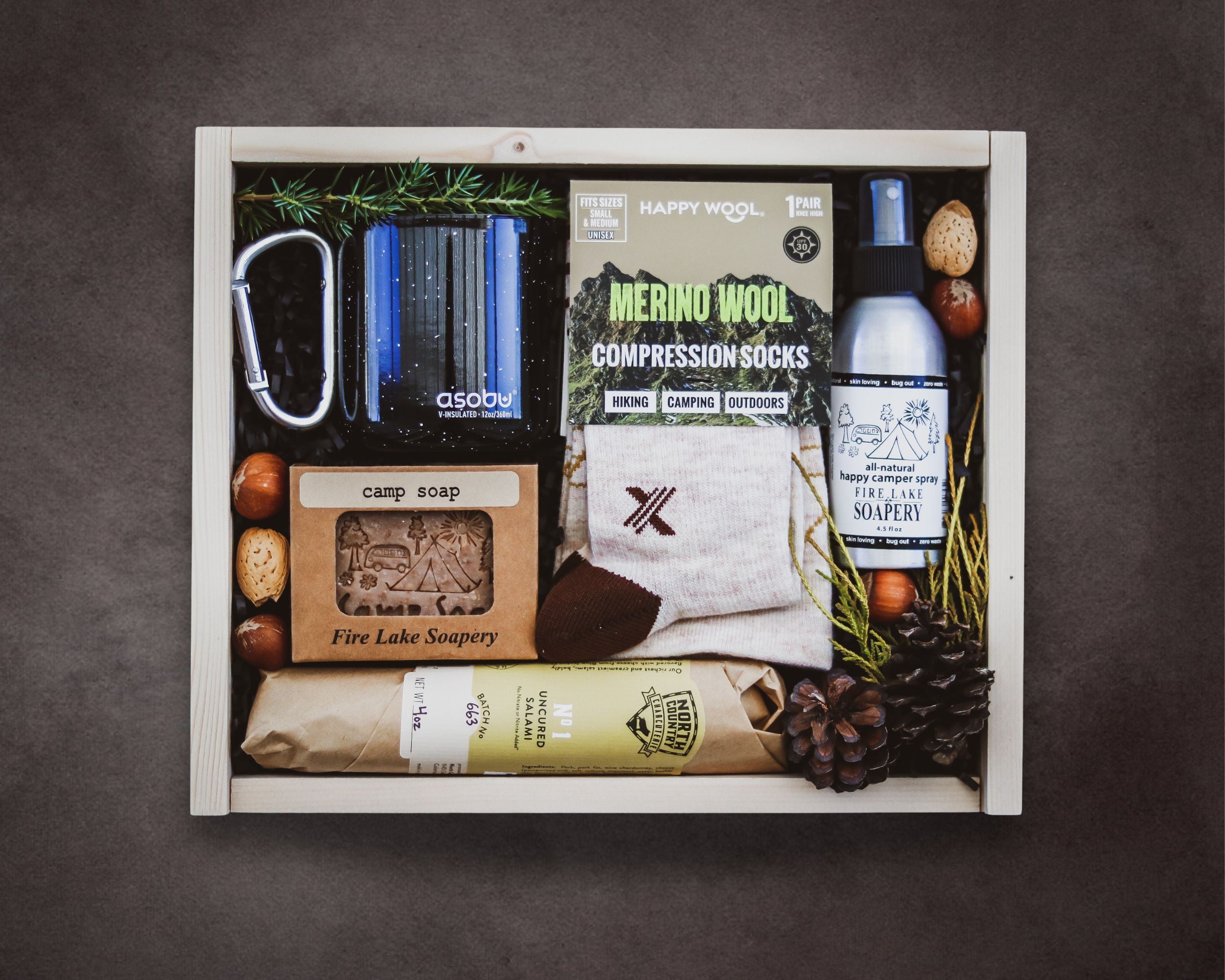 Designed for life outdoors, this curated gift box brings together essential camp and trail favorites in an elevated presentation. Inside are a stainless steel campfire mug with carabiner handle, warm wool socks, uncured salami for on-the-go fuel, a portable fire pit, and rich camp soap to clean up after the day’s adventures. A thoughtful gift for an outdoorsy dad, brother, partner, friend, or colleague. Available with or without a soft faux fur marble throw blanket or a tartan natural wool deluxe blanket for added comfort. The gift box can also be engraved with your logo or personalized with the engraved name and/or artwork - creating a truly special touch that elevates your gift.