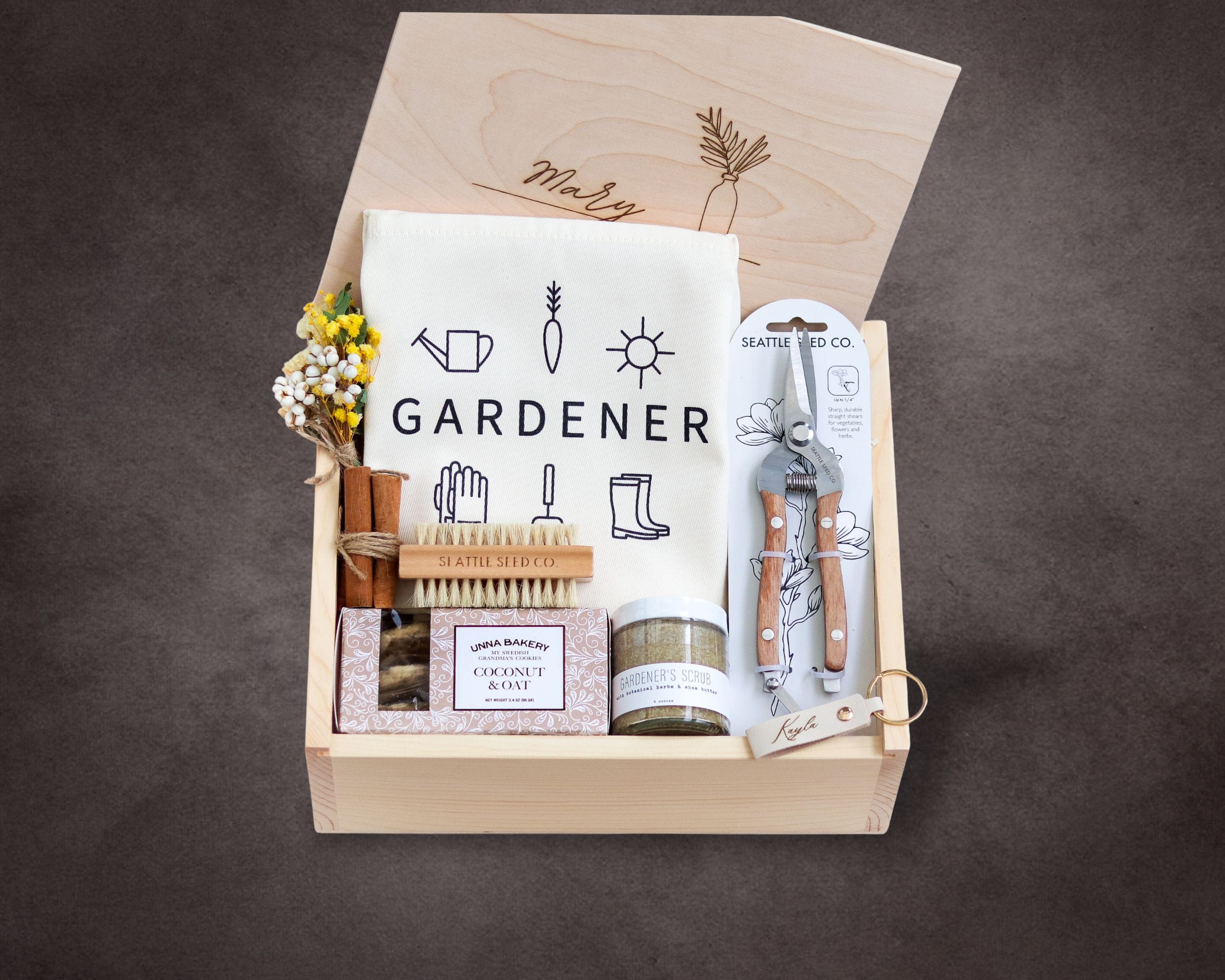 Designed for those who find joy in tending plants and watching things grow, this refined gardening gift set blends beauty, practicality, and care. The collection includes a gardener’s waist apron, award-winning handmade coconut & oak cookies, a vegetable and nail brush, pruning shears, and a handmade exfoliating and moisturizing scrub to keep hardworking hands soft and well cared for. An elegant, useful gift for Mother’s Day, birthdays, or gracious hostess moments. Presented in our signature gift box, it can be engraved with your logo or personalized with names and custom artwork for a timeless, elevated finish.