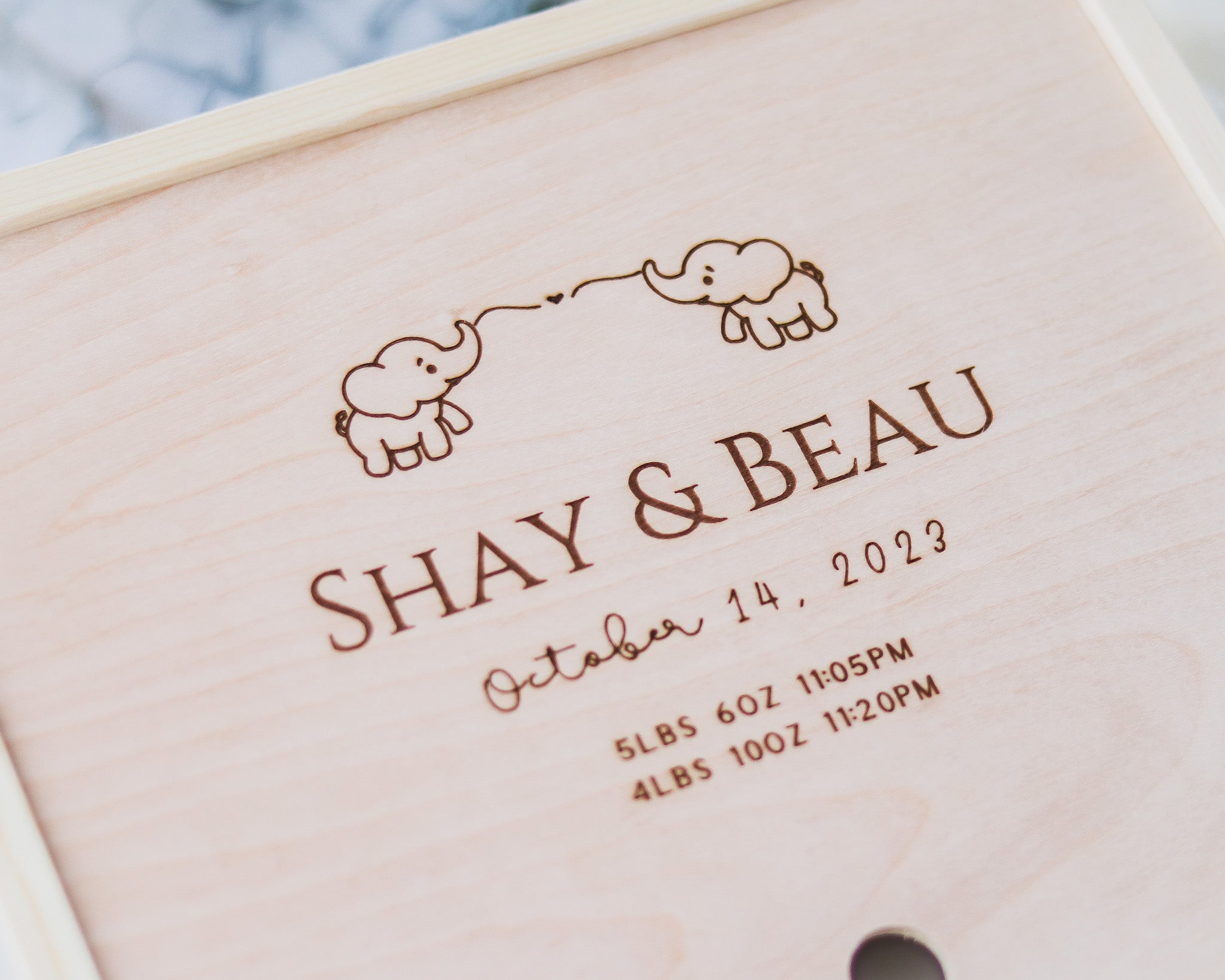 Celebrate the arrival of twins (how exciting!) with our charming personalized wooden keepsake boxes! Crafted from exquisite pine wood, each box is lovingly handmade to preserve your little ones' precious childhood memories. Whether it's their first booties or a cherished photo, this elegant keepsake box is the perfect way to treasure those special moments for years to come.