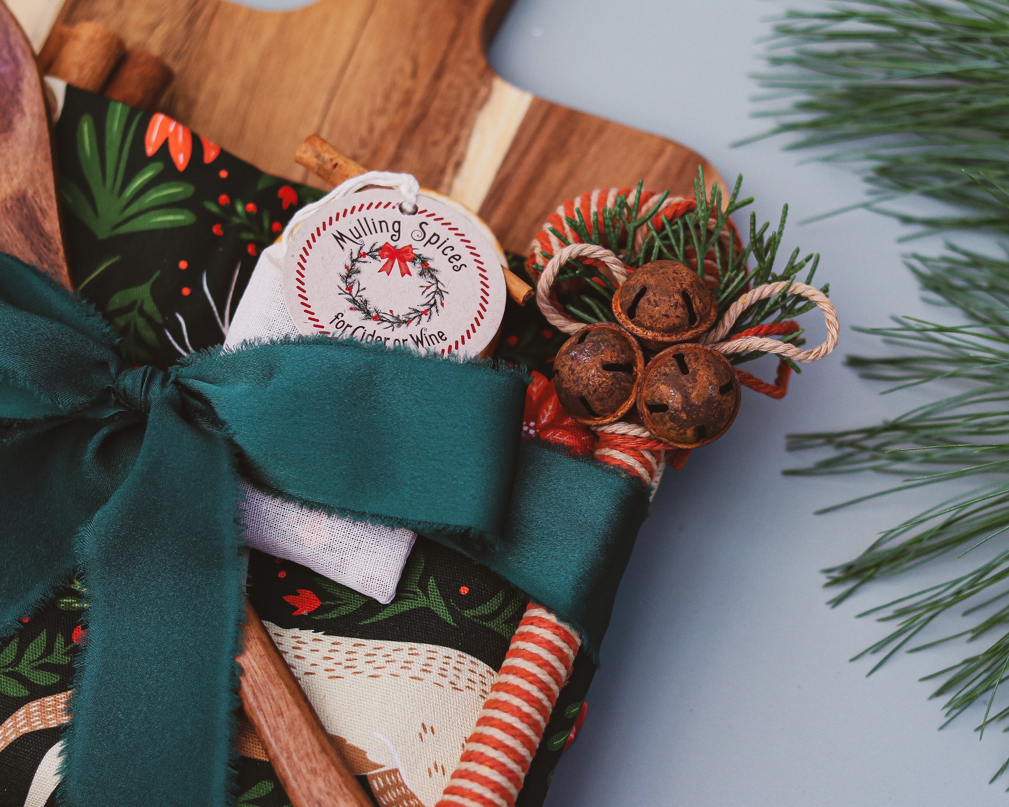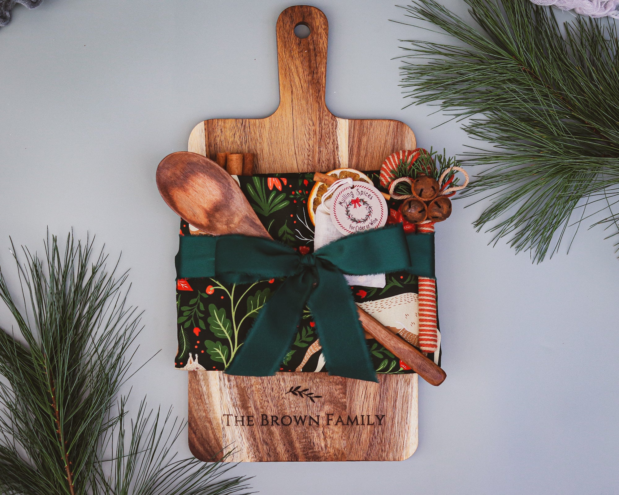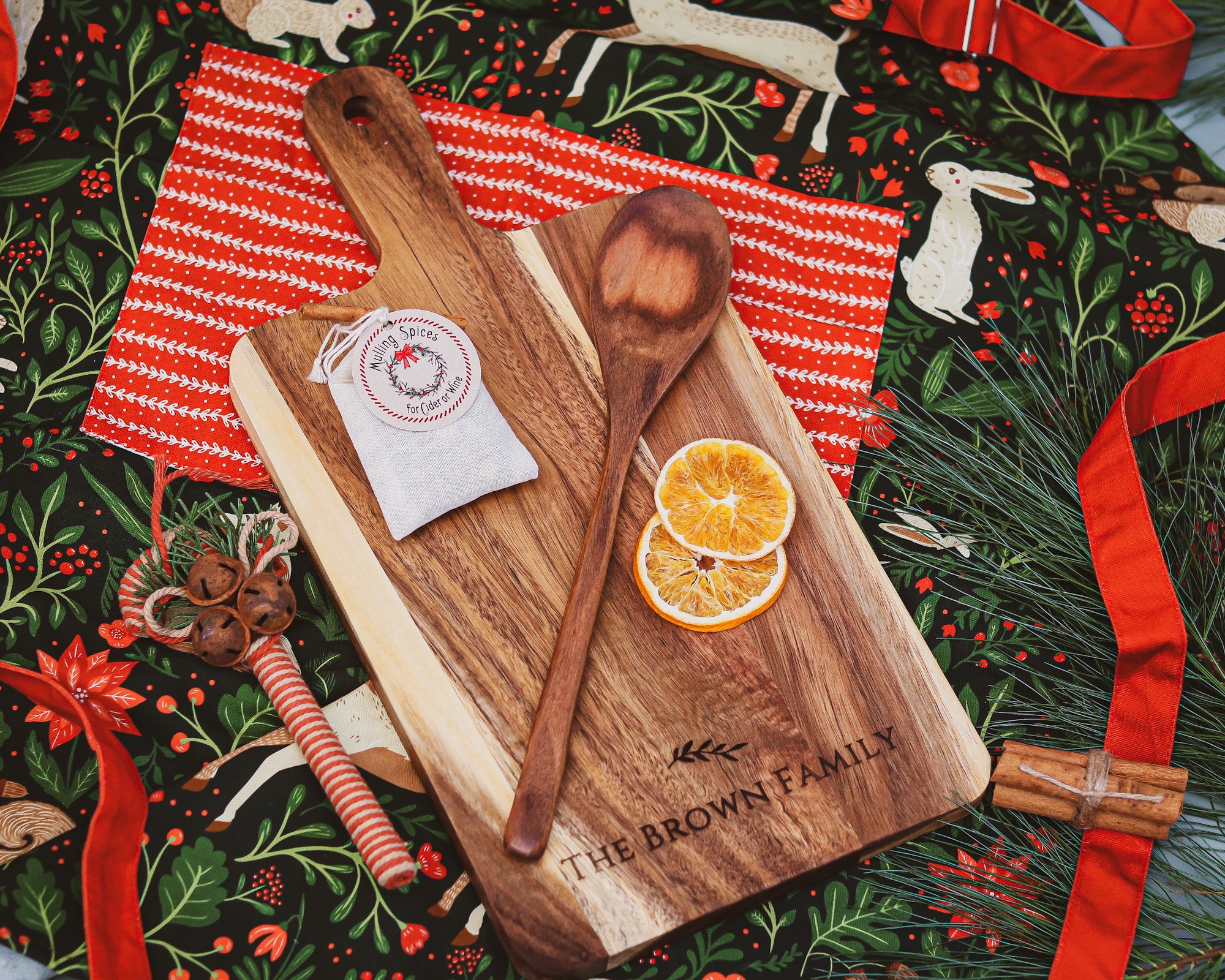 Bring holiday warmth into the kitchen with this festive gift set, thoughtfully arranged on a handcrafted acacia wood cutting board. Inside, you’ll find a wooden cooking spoon, a cozy holiday apron, and a fragrant mulled spice blend - perfect for creating seasonal drinks or festive recipes. Finished with rustic touches like cinnamon sticks and jingle bells, this set captures the spirit of Christmas in both flavor and style.