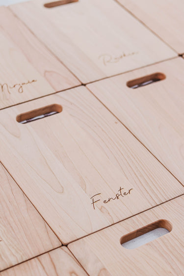 Your brand can shine through logo engraving (cutting boards, wooden boxes, leather tags, coasters, notebooks, flasks, utensils, and more), custom graphic design, custom printed cards, stickers, and sleeves.