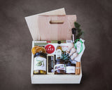 Created for vegetarian food lovers, this thoughtfully curated gift box brings together everything needed for a beautifully composed charcuterie-style spread. Inside are artisan Pizzetta savory biscuits, Tuscan virgin olive oil, natural raw honey, vial salt, organic green olives, bruschetta, harvest vegetable cheese, and Italian cheese board tools. Presented in our signature handcrafted pine wood box, the gift may be paired with an optional handmade cutting board - engraved or left natural. The box itself can also be personalized with a name, artwork, or logo, transforming an elegant gift into a lasting keepsake.